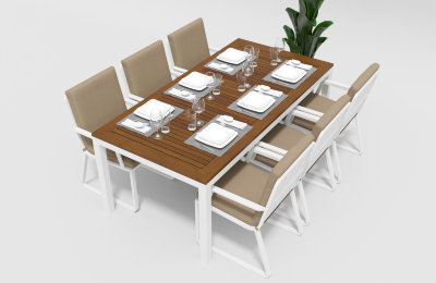 Материалы и цвета: каркас мебели выполнен из всесезонного алюминия с порошковым покрытием белого цвета, подушки спинок и сидений стульев обшиты уличной тканью бежевого цвета (А13809) с водоотталкивающей пропиткой, толщина подушек 5 см, столешница обеденного стола изготовлена из тика.