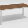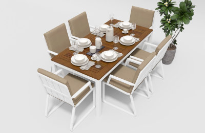 Материалы и цвета: каркас мебели выполнен из всесезонного алюминия с порошковым покрытием белого цвета, подушки спинок и сидений стульев обшиты уличной тканью бежевого цвета (А13809) с водоотталкивающей пропиткой, толщина подушек 5 см, столешница обеденного стола изготовлена из тика.