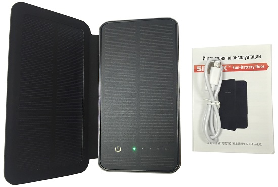 Зарядное устройство "SITITEK Sun-Battery Duos", состоящее из двух солнечных панелей и аккумулятора большой (10000 мА/ч) емкости. Выполнено в раскладном металлическом корпусе, может использоваться для зарядки различной мелкой портативной техники: мобильных телефонов, цифровых фотокамер, MP3-плееров и др. Сам прибор может заряжаться от солнечной энергии или через USB-кабель от ПК. Для того чтобы зарядить свой гаджет при отсутствии розетки, просто подключите его к системе автономного питания, используя USB-кабель, который идет в комплекте.